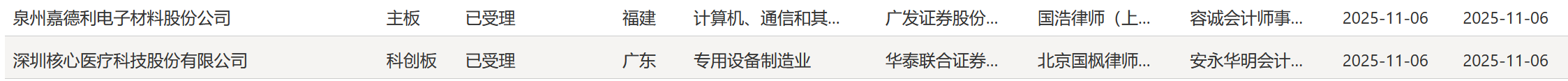 11月6日,上交所披露,泉州嘉德利电子材料股份公司(嘉德利)、深圳核心医疗科技股份有限公司(核心医疗)上交所IPO申请已获受理。